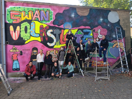 Unter Anleitung von Oskar Klinge, einem Graffiti Künstler aus Leipzig, finanziert von der Stadt Borna - Engagement von Herrn Rabold - entstanden beeindruckende Graffitis, die nicht nur die Wand am Volksplatz verschönerten, sondern auch die Kreativität und den Teamgeist der Schülerinnen förderten.