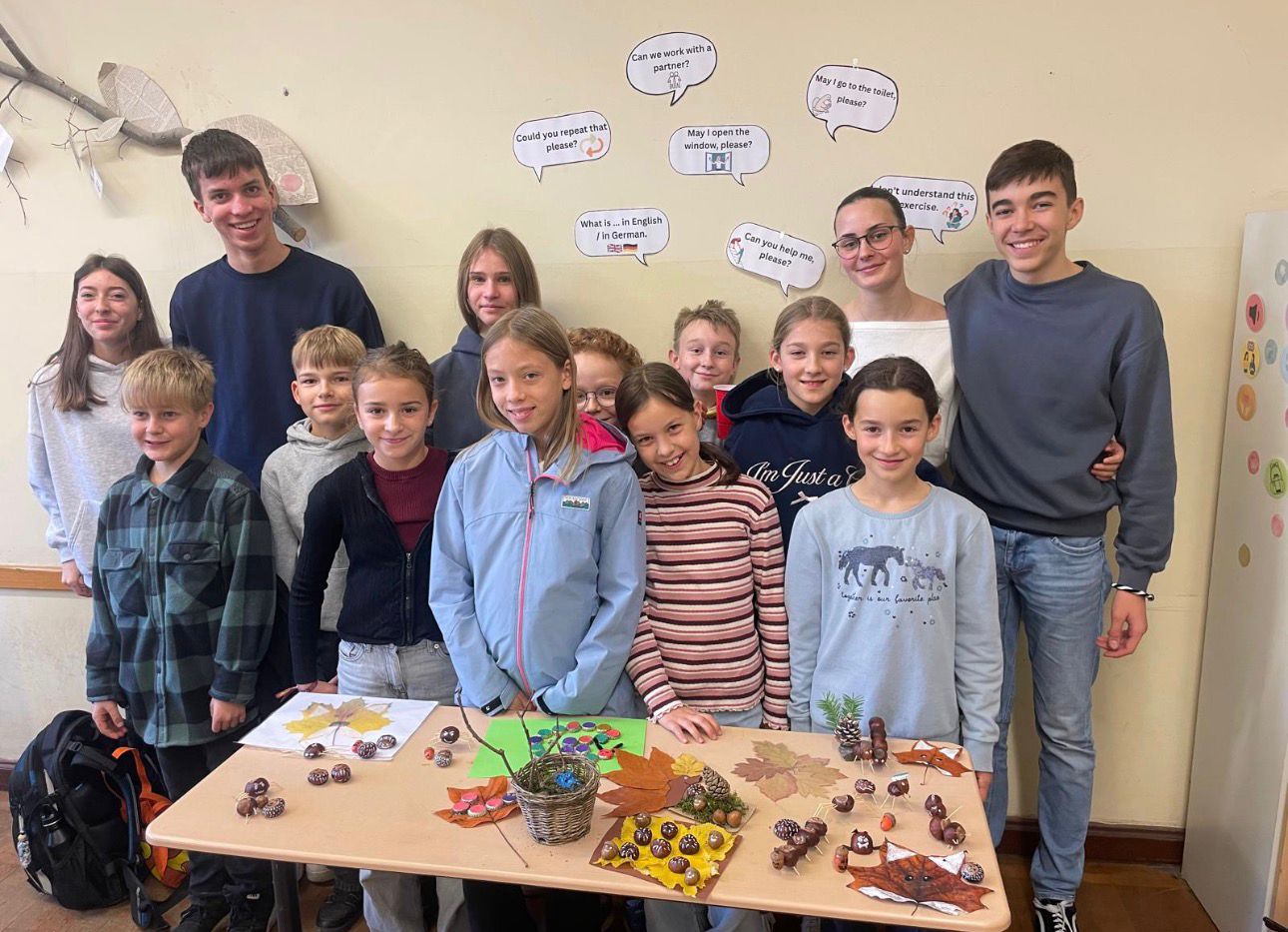 Beim gemeinsamen Herbstprojekt gestalteten die Fünftklässler mit ihren Paten aus Klasse 9 fantasievolle Figuren aus Naturmaterialien. Mit großer Begeisterung und beeindruckender Kreativität entstanden kleine Kunstwerke, die den Tag für alle Beteiligten – Schüler wie Lehrkräfte – besonders schön machten.