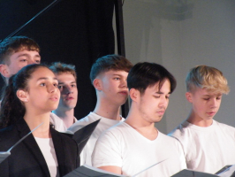 Mit dabei waren Gesangssolisten und Instrumentalisten an Gitarre, Fagott, Klavier, Trompete und Querflöte mit beeindruckenden Leistungen. Die extragroßen herbeigeschafften Podeste wurden zur Bühne für den Kleinen Chor (Leitung: Frau Tripps), den Oberstufenchor (Leitung: Frau Müller), das Gesangsensemble (Leitung: Frau Friedrich) und die Schulband (Leitung: Herr Taubert).