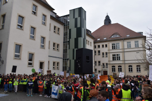 Als Schülerin war ich am Freitag, den 01.03.2024, Teil eines beeindruckenden Schülerprotests auf unserem Schulhof - dem ersten in unserer Schulgeschichte. Fast alle Schüler sowie Eltern, Lehrer und die Schulleitung versammelten sich, um für unsere Forderungen einzustehen. Viele Schüler hatten Plakate mit kreativen Sprüchen gestaltet. Zu lesen waren Forderungen wie „Wir träumen von Räumen“ oder „Gute Bildung gibt es nicht im Sonderangebot“. Die Atmosphäre war von Spannung und Entschlossenheit geprägt, insbesondere als alle Schüler den von Arne und Hans (Klasse 12) umgeschriebenen Song "Zeit, dass sich was dreht" von $oho Bani gesungen haben. Alle Schülerinnen und Schüler waren vor den Augen der eingeladenen Medienvertreter vereint in ihren Forderungen nach mehr Platz, ordentlichen Toiletten, einer zeitgemäßen digitalen Ausstattung sowie nach Normalität und Gerechtigkeit in unserer Schule.