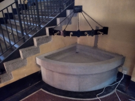 Und mit Geschichte hat dieses Projekt auch zu tun: In alten Unterlagen zur Schulhistorie ist vermerkt, dass es einen solchen Trinkbrunnen schon im Jahr 1908 gegeben haben muss. Warum dieser dann irgendwann verschwand, ist nicht mehr genau zu recherchieren. Das einzig erhaltenen Originalteil,das verbaut wurde, ist die Metallplatte am oberen Rand, an der die Ketten aufgehangen sind.