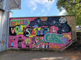 Unter Anleitung von Oskar Klinge, einem Graffiti Künstler aus Leipzig, finanziert von der Stadt Borna - Engagement von Herrn Rabold - entstanden beeindruckende Graffitis, die nicht nur die Wand am Volksplatz verschönerten, sondern auch die Kreativität und den Teamgeist der Schülerinnen förderten.