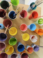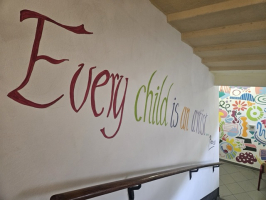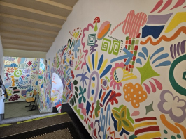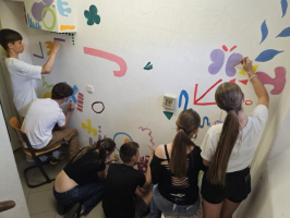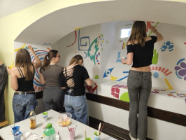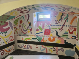 Manchmal bedarf es nur ein bisschen Farbe und vieler motivierter Hände. Was ursprünglich als Projekt der Klasse 9b begann, hat sich schnell zu einer schulweiten Aktion entwickelt und in Null-Komma-Nichts standen Freiwillige aller Klassenstufen gemeinsam mit bunten Fingern und guter Laune nebeneinander. Unter der Leitung der 9b gemeinsam mit Frau Hoffmann machten sich bald Schülerinnen und Schüler aller Jahrgangsstufen daran, den bislang kargen Kellerbereich in ein buntes, einladendes Kunstwerk zu verwandeln. Mit Pinseln, Rollen und vielen kreativen Ideen wurde aus limonengrünen Wänden eine farbenfrohe Galerie. Nach dem Vorbild der „Murals“ von Ashley Mary zieren nun abstrakte Motive collagenhaft die Wände. Unterstützt durch Musik und kleine Stärkungen – Gummibärchen durften dabei natürlich nicht fehlen – arbeiteten die Schülerinnen und Schüler motiviert und mit viel Freude an ihrem gemeinsamen Projekt. Das Ergebnis kann sich sehen lassen: Aus einem schlichten Schulflur ist ein „Künstlerbereich“ geworden, der die Kreativität und den Teamgeist unserer Schulgemeinschaft widerspiegelt. Ganz besonders zeigt dieses Projekt, wie recht Pablo Picasso hatte, als er sagte: „Every child is an artist.“ In jedem von uns steckt Kreativität – und wenn man sie gemeinsam entfaltet, kann etwas Großartiges entstehen.Der bunte Flur ist nun nicht nur ein schönerer Ort, sondern auch ein Symbol dafür, was entstehen kann, wenn viele Hände zusammenarbeiten.