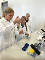 Dort durften wir selbst in die Rolle von jungen Wissenschaftlerinnen und Wissenschaftlern schlüpfen. Statt trockener Theorie standen moderne Methoden der Genetik auf dem Programm: PCR, also die berühmte „Gen-Kopiermaschine“, oder auch die Gel-Elektrophorese, mit der DNA-Banden sichtbar gemacht werden können. Mit Kittel und Handschuhen ausgestattet, probierten wir Arbeitstechniken aus, die nicht nur im Lehrplan wichtig sind, sondern auch in der echten Forschung täglich genutzt werden.