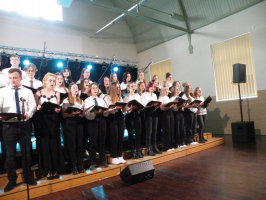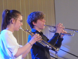 Mit dabei waren Gesangssolisten und Instrumentalisten an Gitarre, Fagott, Klavier, Trompete und Querflöte mit beeindruckenden Leistungen. Die extragroßen herbeigeschafften Podeste wurden zur Bühne für den Kleinen Chor (Leitung: Frau Tripps), den Oberstufenchor (Leitung: Frau Müller), das Gesangsensemble (Leitung: Frau Friedrich) und die Schulband (Leitung: Herr Taubert).