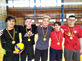 Am Freitag vor den Ferien war es mal wieder soweit, die Schulmeisterschaften im Volleyball der Sek.II fanden statt. In der Turnhalle Ost kämpften 11 Mannschaften der Jungen um die Schulmeisterschaft, in der Turnhalle Glück-Auf waren 12 Mädchenmannschaften am Ball. Gebildet wurden die Mannschaften aus den Sportkursen der 11. und 12. Klassen. Die jungen Männer spielten in drei Vorrundengruppen die Plätze für zwei Hauptrundengruppen und das Platzierungsturnier der Plätze 6 bis 11 aus. Den Hauptrundenspielen folgten das Spiel um Platz 5, die Halbfinal- und Finalspiele. Nach insgesamt 45 Spielen stand als Sieger bei den Jungen der 12er Kurs von Herrn Jackel fest, gefolgt vom Titelverteidiger, der Mannschaft 1 vom 12er Kurs von Herrn Müller. Im Spiel um Platz 3 gewann der Kurs 11-3 von Herrn Schneider gegen die 2.Mannschaft des 12er Kurses von Herrn Müller. Vor den Augen der Sportlehrer, Kollegen und der Mitschüler gab es spannende, faire, und vor allem im Halbfinale und Finale auch gutklassige Volleyballspiele zu sehen.