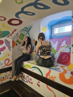 Manchmal bedarf es nur ein bisschen Farbe und vieler motivierter Hände. Was ursprünglich als Projekt der Klasse 9b begann, hat sich schnell zu einer schulweiten Aktion entwickelt und in Null-Komma-Nichts standen Freiwillige aller Klassenstufen gemeinsam mit bunten Fingern und guter Laune nebeneinander. Unter der Leitung der 9b gemeinsam mit Frau Hoffmann machten sich bald Schülerinnen und Schüler aller Jahrgangsstufen daran, den bislang kargen Kellerbereich in ein buntes, einladendes Kunstwerk zu verwandeln. Mit Pinseln, Rollen und vielen kreativen Ideen wurde aus limonengrünen Wänden eine farbenfrohe Galerie. Nach dem Vorbild der „Murals“ von Ashley Mary zieren nun abstrakte Motive collagenhaft die Wände. Unterstützt durch Musik und kleine Stärkungen – Gummibärchen durften dabei natürlich nicht fehlen – arbeiteten die Schülerinnen und Schüler motiviert und mit viel Freude an ihrem gemeinsamen Projekt. Das Ergebnis kann sich sehen lassen: Aus einem schlichten Schulflur ist ein „Künstlerbereich“ geworden, der die Kreativität und den Teamgeist unserer Schulgemeinschaft widerspiegelt. Ganz besonders zeigt dieses Projekt, wie recht Pablo Picasso hatte, als er sagte: „Every child is an artist.“ In jedem von uns steckt Kreativität – und wenn man sie gemeinsam entfaltet, kann etwas Großartiges entstehen.Der bunte Flur ist nun nicht nur ein schönerer Ort, sondern auch ein Symbol dafür, was entstehen kann, wenn viele Hände zusammenarbeiten.
