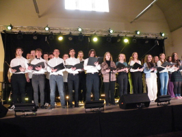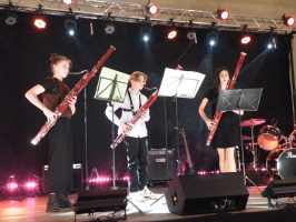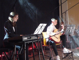 Mit dabei waren Gesangssolisten und Instrumentalisten an Gitarre, Fagott, Klavier, Trompete und Querflöte mit beeindruckenden Leistungen. Die extragroßen herbeigeschafften Podeste wurden zur Bühne für den Kleinen Chor (Leitung: Frau Tripps), den Oberstufenchor (Leitung: Frau Müller), das Gesangsensemble (Leitung: Frau Friedrich) und die Schulband (Leitung: Herr Taubert).